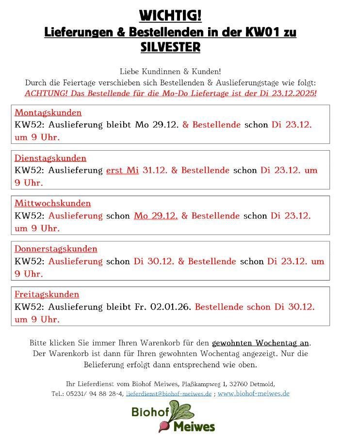 Auch in der Silvesterwoche beliefern wir Euch. Für alle Montags- bis Donnerstagskunden ist das Bestellende Dienstag der 23.12.25. Die Freitagskunden haben am Dienstag den 30.12.25 ihr Bestellende. Euren Liefertag entnehmt Ihr bitte der unten stehenden Feiertags-Info.