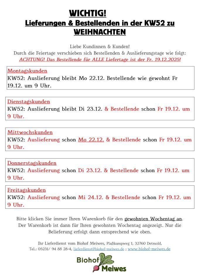 Wir liefern in der Weihnachtswoche die Biokiste aus. Bestellende für ALLE Kunden die in der Woche eine Kiste möchten, ist Freitag der 19.12.25 um 9 Uhr! Euren Liefertag entnehmt Ihr bitte der unten stehenden Feiertags-Info.